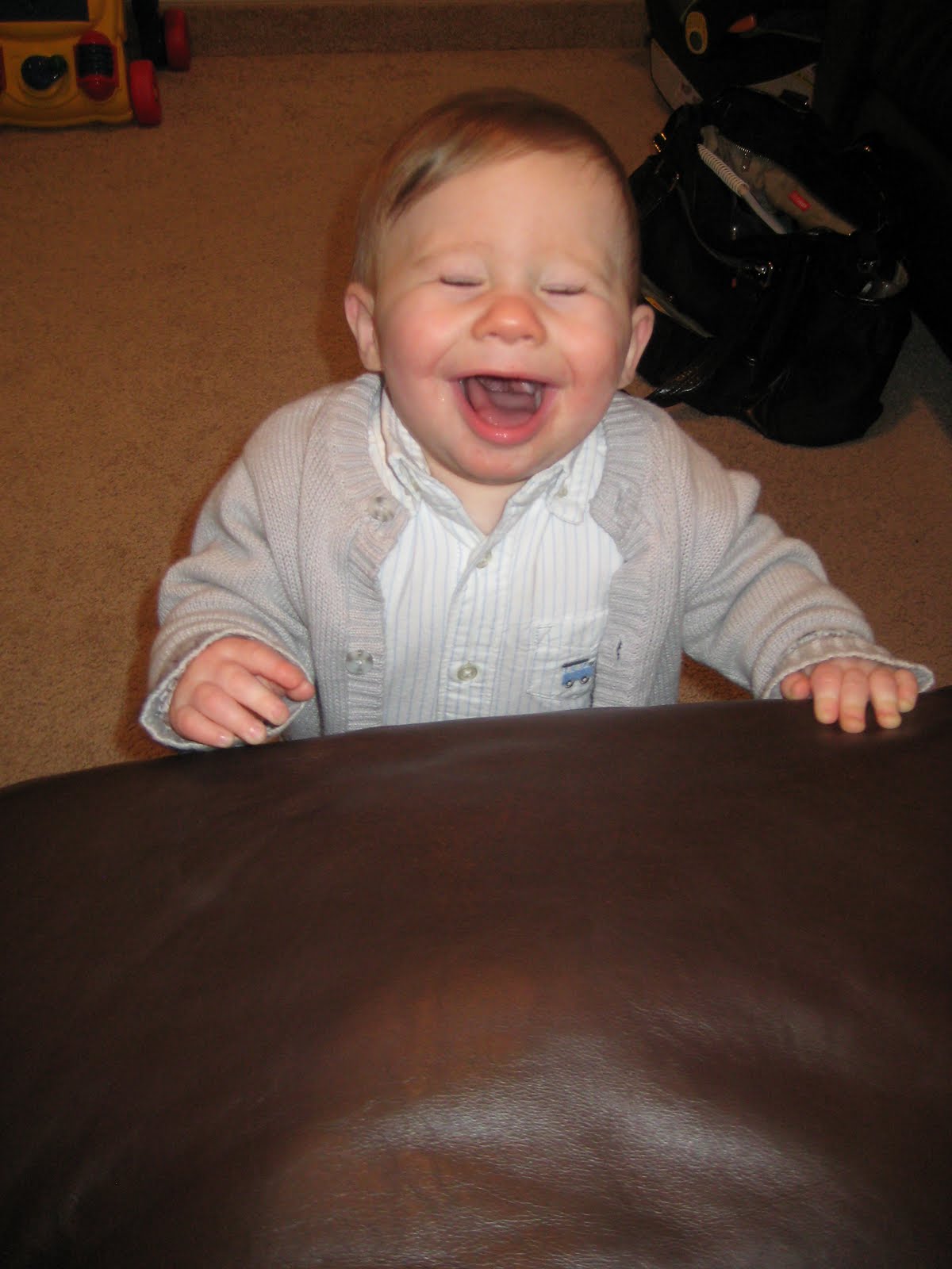 As you know from the earlier post he his now clapping, and waving...it's really cute because he turns his wrist alot when he waves like the miss america wave. When he turned 8 months he started saying ba ba..and now he says da da but he mixes it alot with ba ba so alot of the time it just sounds like babbling. He also started earlier this month to pick up food very easily and put it in his mouth. Not soo fun when he is on the floor..he finds the tiniest things and puts them in his mouth, there have been times where we caught it too late and have no idea what he ate...even though he couldnt sneak it a couple nights ago..we had just cooked dinner and I picked him up to put him in his highchair and I smelled something really strong and strange on his mouth...turns out he was eating garlic..which explains the face he was makig. I now sweep often =) We have let him try yogart, cottage cheese, cheese, pizza, meat, and lots of different breads...but he pretty much will eat everything and if he sees food he wants it!